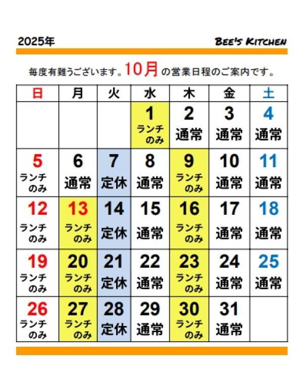 10月の営業日程