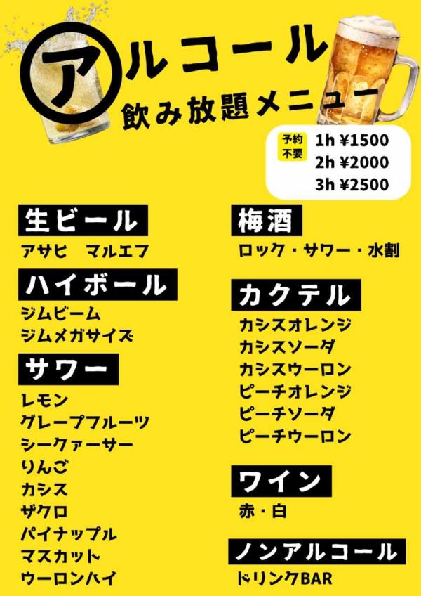 飲み放題アルコールメニュー表