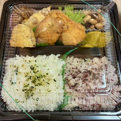 自家製手ごねハンバーグ、白身魚のフライ、焼き肉が入っています(メイン3種類)