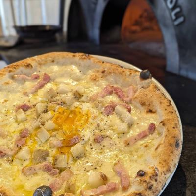 ベーコンと上毛町産さつまいも、半熟卵のピッツァです!ブラックペッパーも忘れずに