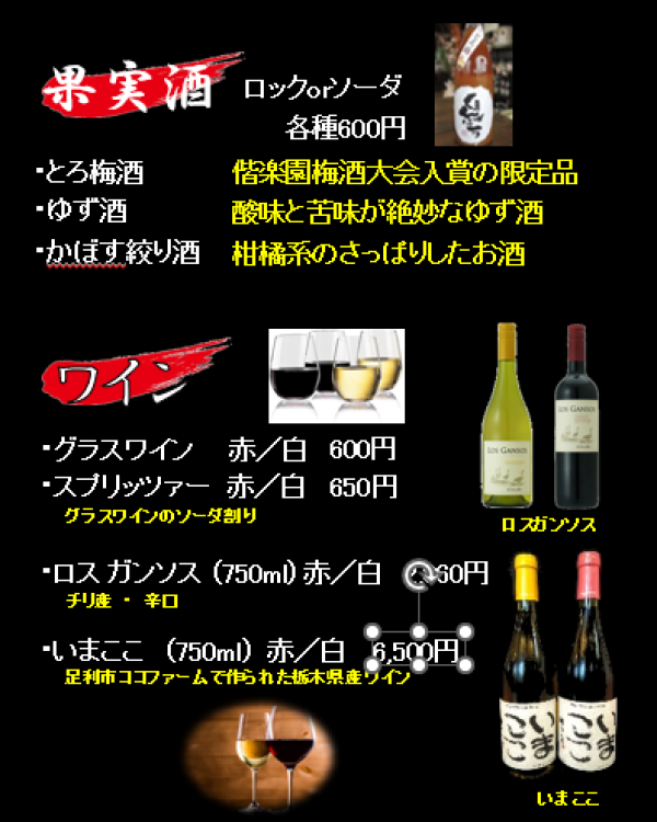 各種果実酒も人気です。 ソーダ割り・ロック お好みの飲み方をお申し付けください! ボトルワインもございます。 「いまここ」 栃木県足利市産のワインです