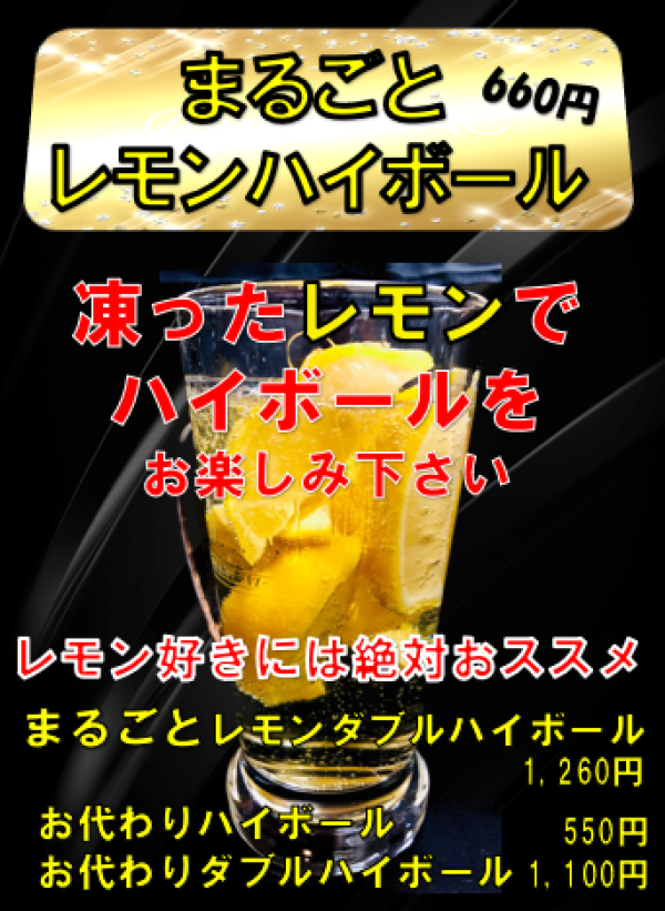 まるごとレモンハイボール 660円 凍ったレモンを まるごと一個入れた 人気のハイボールです(^^♪ お代わりハイボールをご注文で レモンを最後までご堪能できちゃう 面白いハイボール! ダブルもあります! ※メニューは全て税込価格です