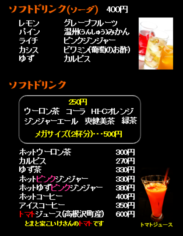 ソフトドリンク 200円~ ソーダ類、 ソフトドリンク (ソフトドリンクは2杯分のメガサイズもあります) 高根沢町産トマトで作った トマトジュースはサッパリした飲み口で 焼肉にもピッタリ! とまと家こいけさんが作ったトマトジュースを ぜひどうぞ! https://www.facebook.com/tomatofamily/ ※メニューは全て税込価格です
