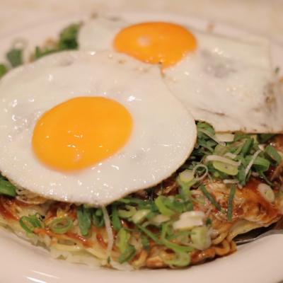 看板メニューの広島風お好み焼き。中に入れる麺をそばかうどんか選べます。そばはパリパリでうどんはもちもち。写真はねぎかけと卵トッピング。ぜひお好きなトッピングを選んで、自分だけのお好み焼きをカスタマイズしてみてください!