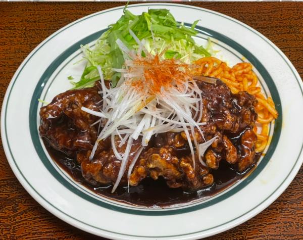 黒酢酢鶏 1300円(税込) 日替わりメニューでしたが人気の為レギュラーメニューになりました。自家製黒酢ソースは国産と本場中国産の酢と醤油をブレンドしました。あたたかい酢鶏に冷やしたネギを添えパプリカで風味をつけました。 ※メニューは全て税込価格です