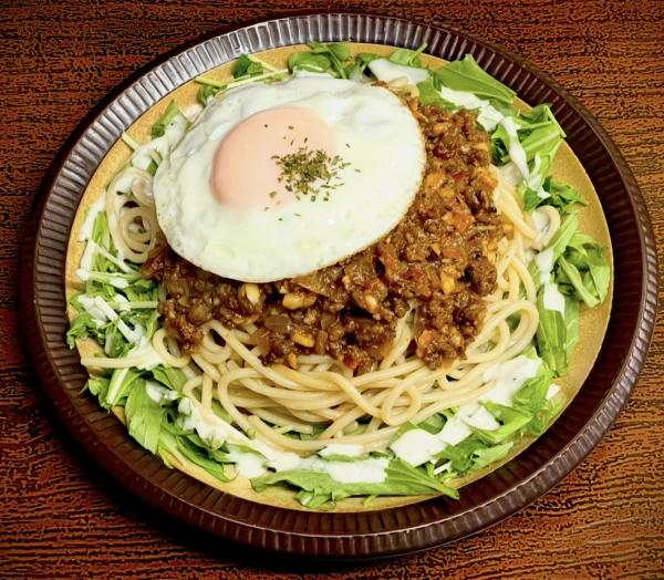 和牛ミートソース(パスタorライス) 1300円(税込) 和牛100%粗挽き肉をフライパンで香ばしく焼き付け自家製トマトソースなどで味付けしました。パスタかライスを選べます(ライスの場合大盛までお値段変わりません。 ※メニューは全て税込価格です