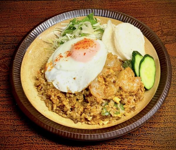 インドネシアやマレーシアで広く食べられている米料理で、ナシ(ごはん)ゴレン(炒める)を組み合わせた炒めご飯です。ケチャップマニスやサンバルソースを使った独特の甘辛の旨みが特徴です。仕上げに風味の良い自家製アジアンソースで仕上げました。くし切りの玉ねぎ、ピーマン、大きなムキエビが3つ入ってます。