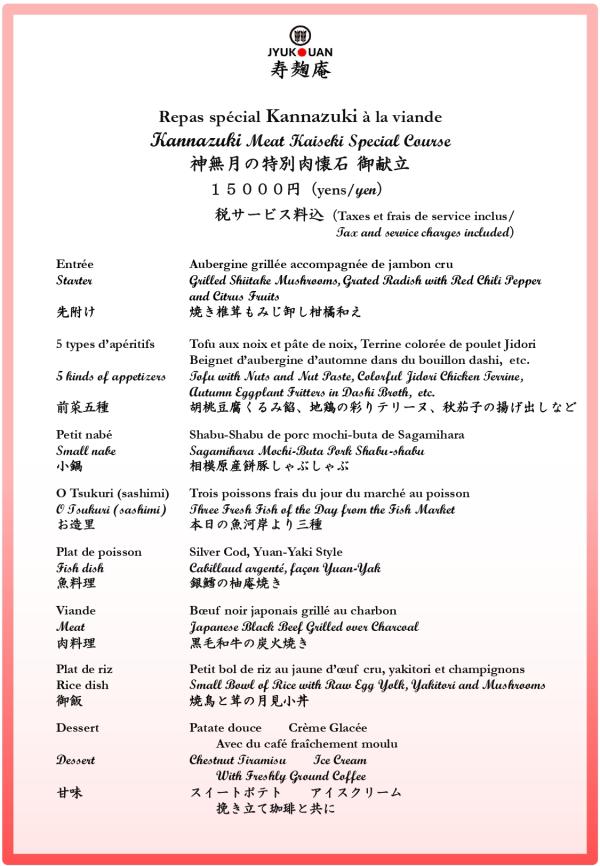 Repas spécial Kannazuki à la viande Nagatsuki Meat Kannazuki Special Course神無月の特別肉懐石 御献立 15000円(yens/yen)