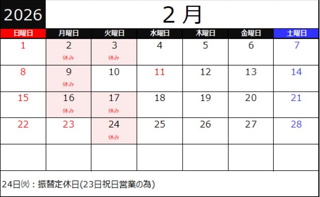 2026年 1月 2月の営業予定