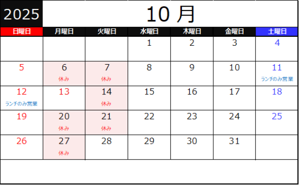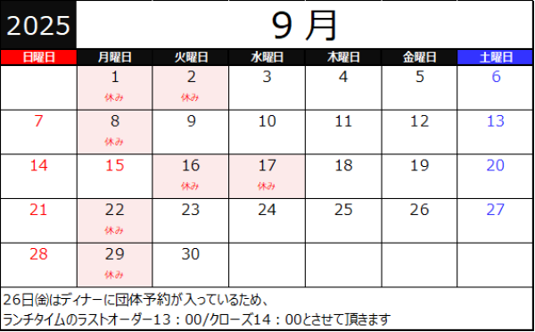 9月26日㈮はディナーに団体予約が入っているため、ランチタイムの営業時間11:00~14:00 (ラストオーダー13:00)となっております。