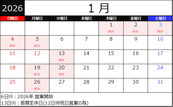 2026年1月は6日㈫11:00より営業予定です。