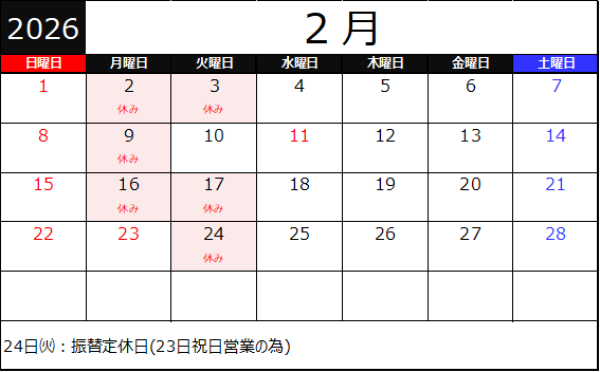 2026年 1月 2月の営業予定