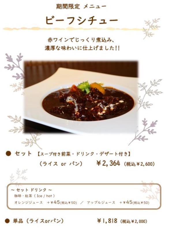 ビーフシチュー 2月中頃までの期間限定で【ビーフシチュー】が登場しました。 じっくりと煮込んだので、牛肉はホロホロと柔らかくコクのあるシチューに仕上がっております。 期間限定のため、気になる方はお早めに。