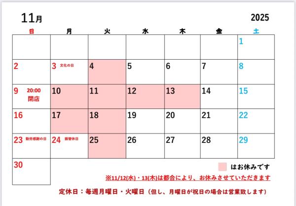 ②11/12(水)13(木)は都合によりお休みさせて頂きます