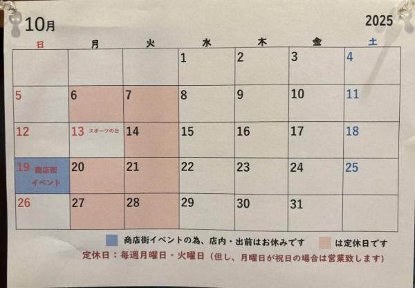 ①10/19(日)商店街イベントの為、店内、出前の営業はお休みです