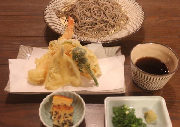 ざる蕎麦と天ぷら盛り合わせの定番ランチです。温かいお蕎麦の天そばも同じ価格でございます。天ぷらは、海老、キス、イカ、野菜2品となります。