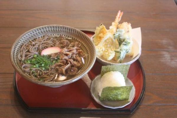温かいお出汁の肉そば、天ぷら盛り合わせ(キス、海老、ちくわ、野菜2種の5品)、自家栽培米の塩おむすびが付いたランチメニューです。たくさん食べたいお客様は、大盛をおすすめします!(250円UP)