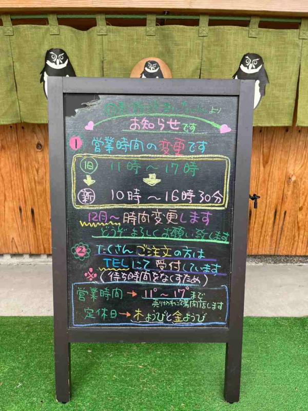 フクロウ(ヨルちゃん)の焼印入りの回転饅頭を美味しく召し上がっていただき、フクロウが皆様に福を運び幸福が回るという願いを込めて、店名を『回転饅頭 ヨルちゃん』と決めました。